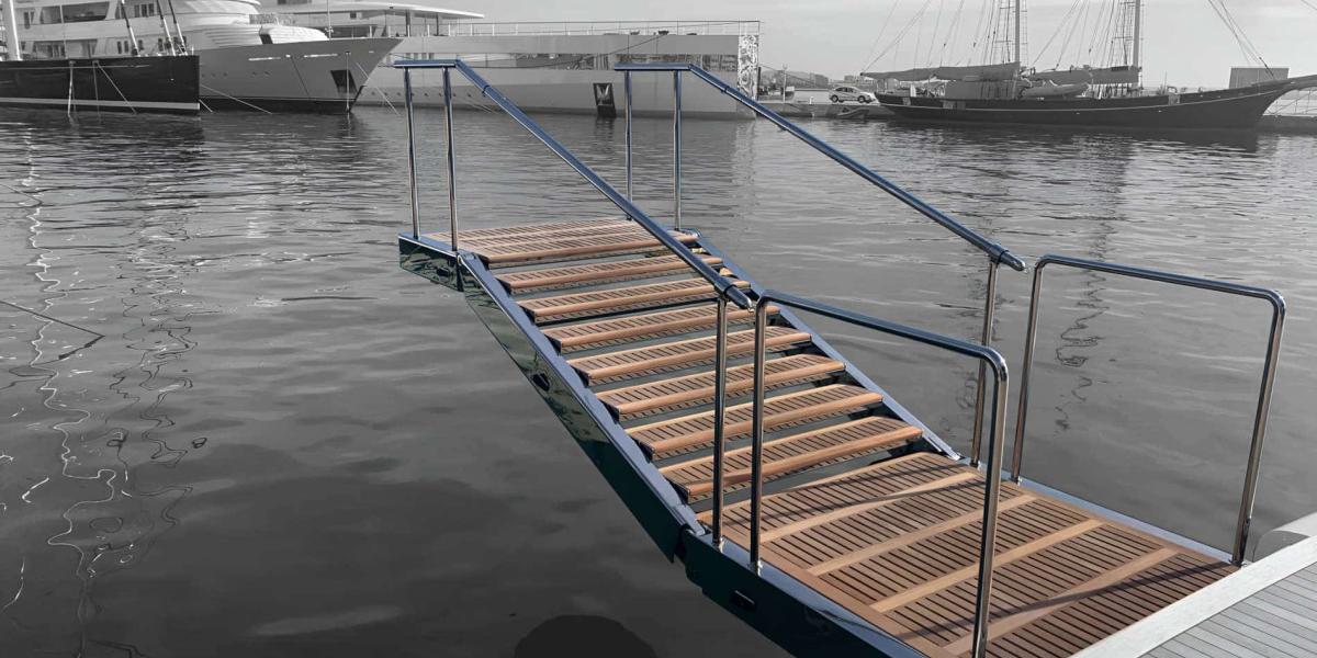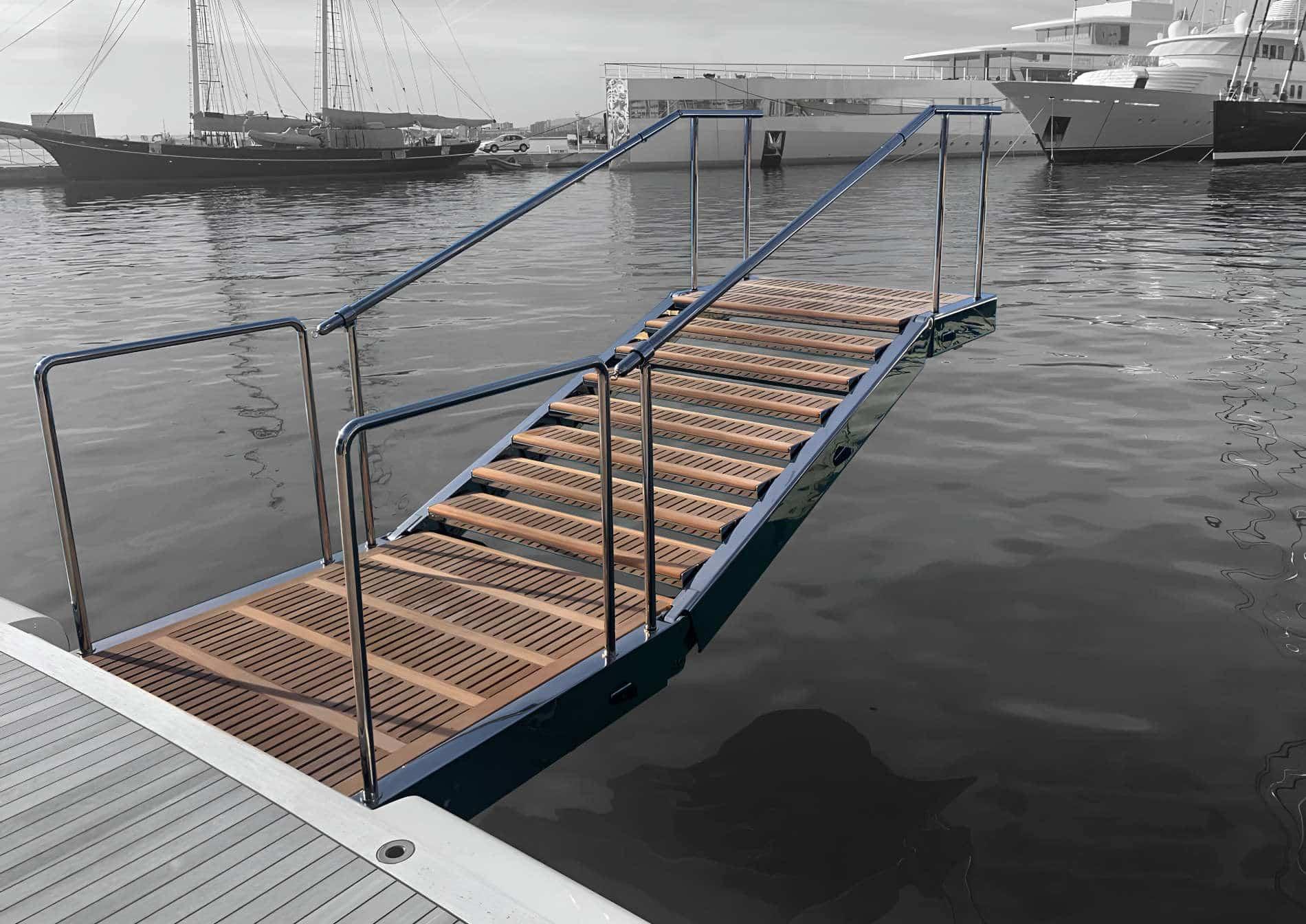 Scale da bagno idrauliche interamente realizzate in acciaio inox lucidato, dotate di scalini autolivellanti rivestiti in teak e complete di candelieri, manuali o automatici, anch’essi lucidati. Su richiesta del cliente possono essere sviluppate diverse configurazioni: dalla versione standard con movimentazione esclusivamente verso il basso, fino a quella con rotazione verso l’alto, che consente un utilizzo multifunzionale anche come passerella.