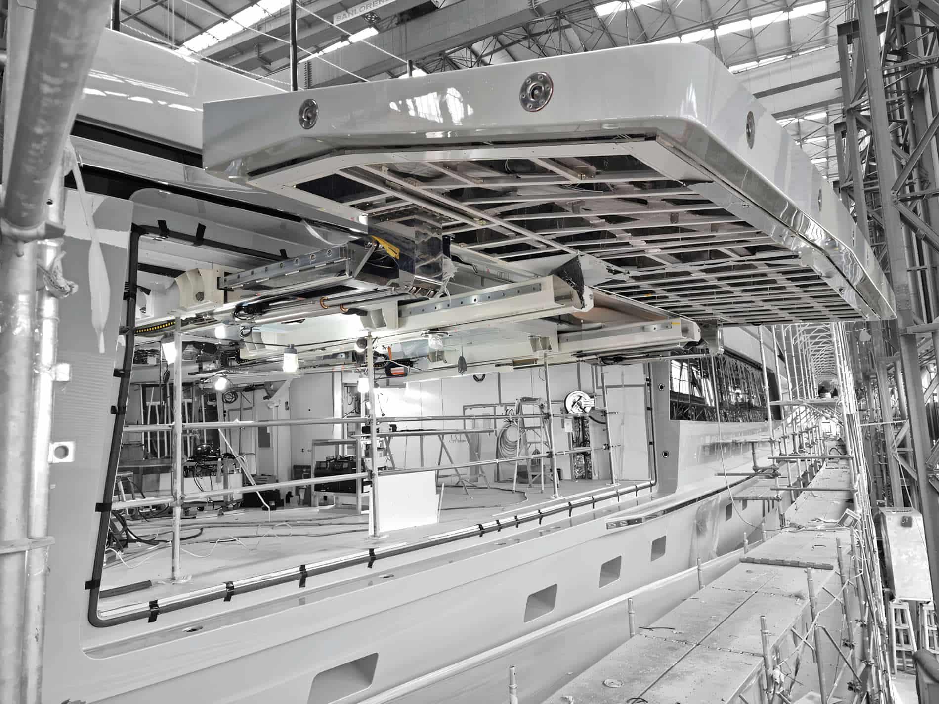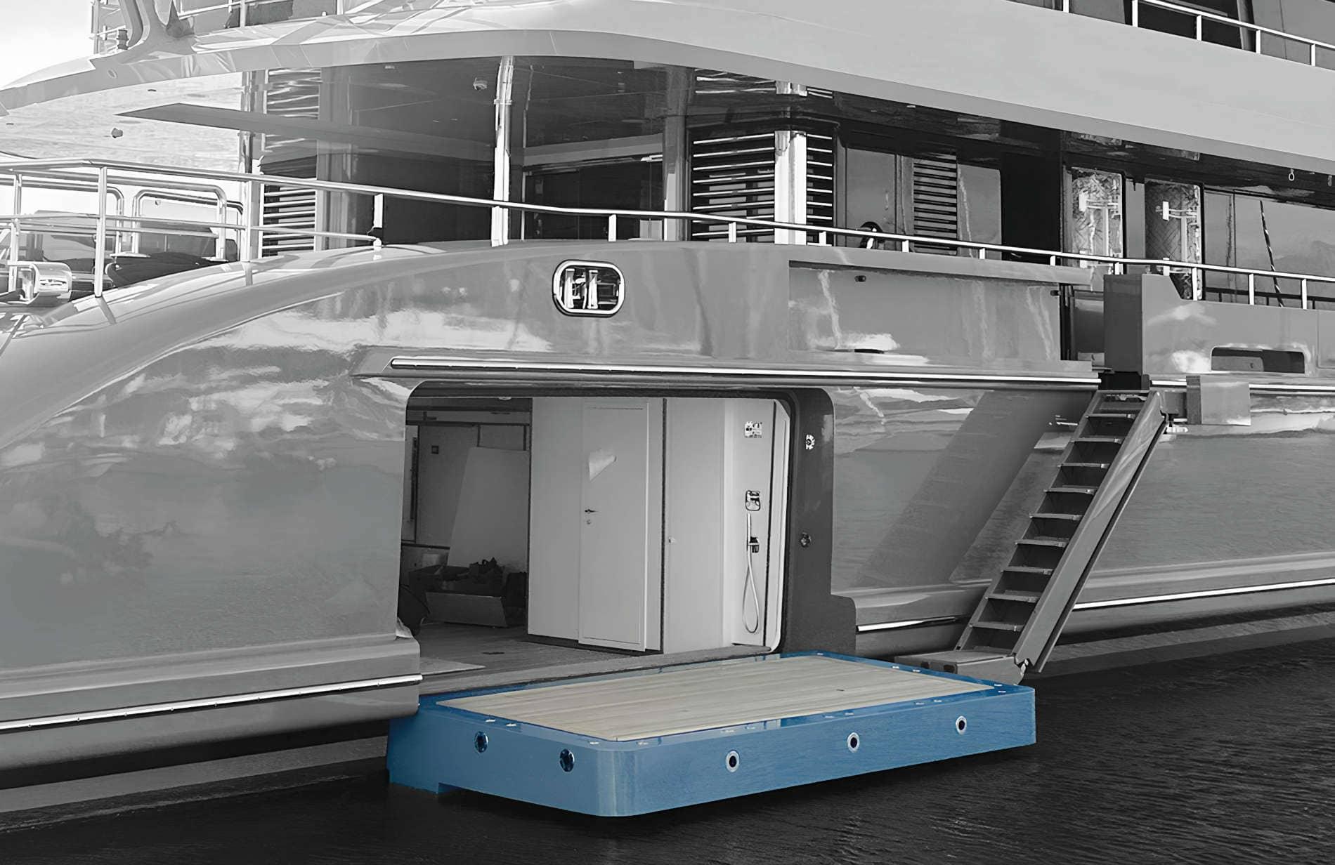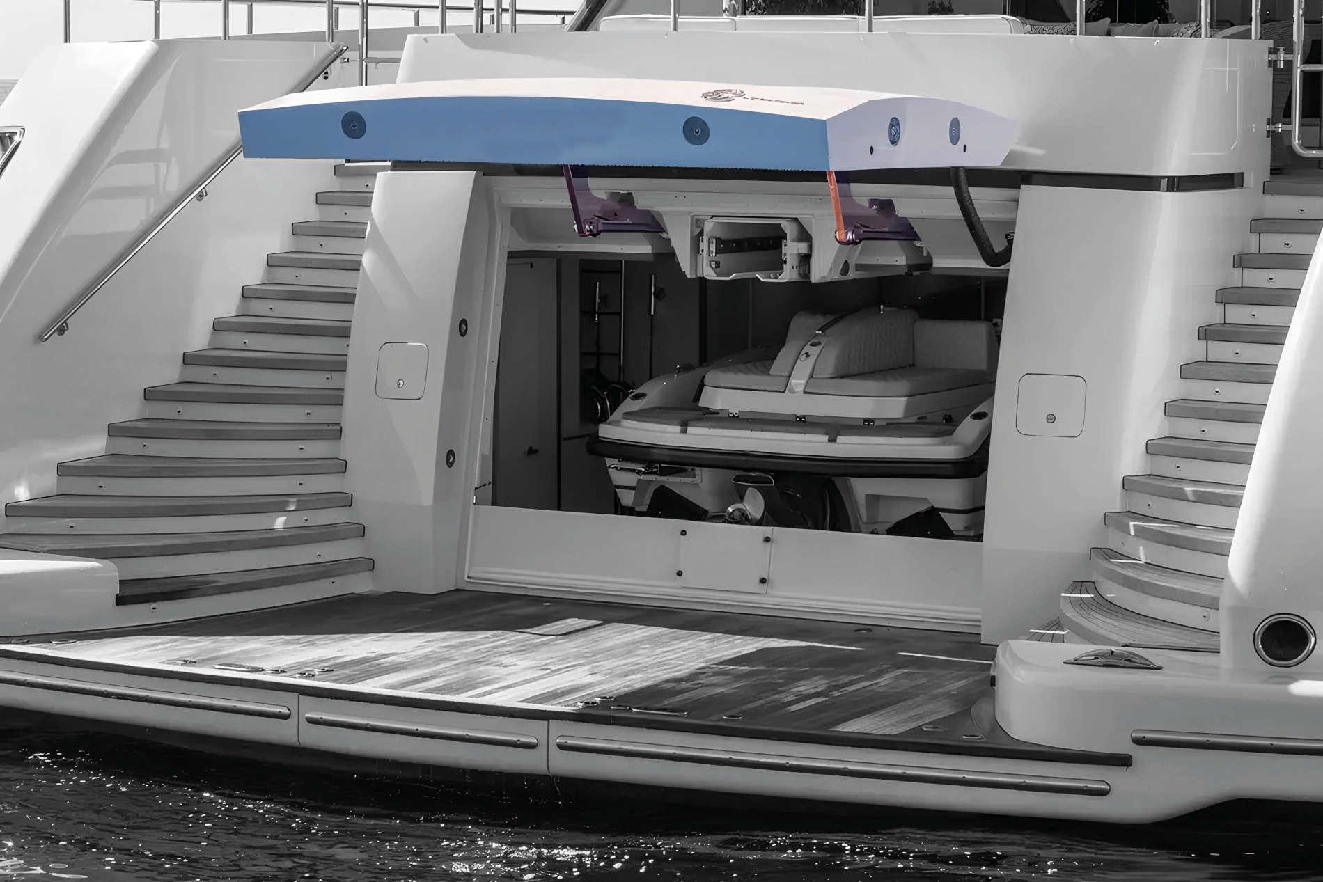 Automatic systems for side garage doors manufactured with specifically designed stainless steel hinges managed by high-performance hydraulic systems. Kinematics are developed starting from the drawings supplied by the shipyard assuring perfect integration with the yacht structure. An accurate design puts aesthetics, functionality and maximum reliability together. Automatic systems can be fitted with sensors managing the opening and closing movements and with safety blocking devices during navigation. Roto-translating opening systems combine telescopic movement with rotation and assure fluidity ergonomics and safety in each operation.